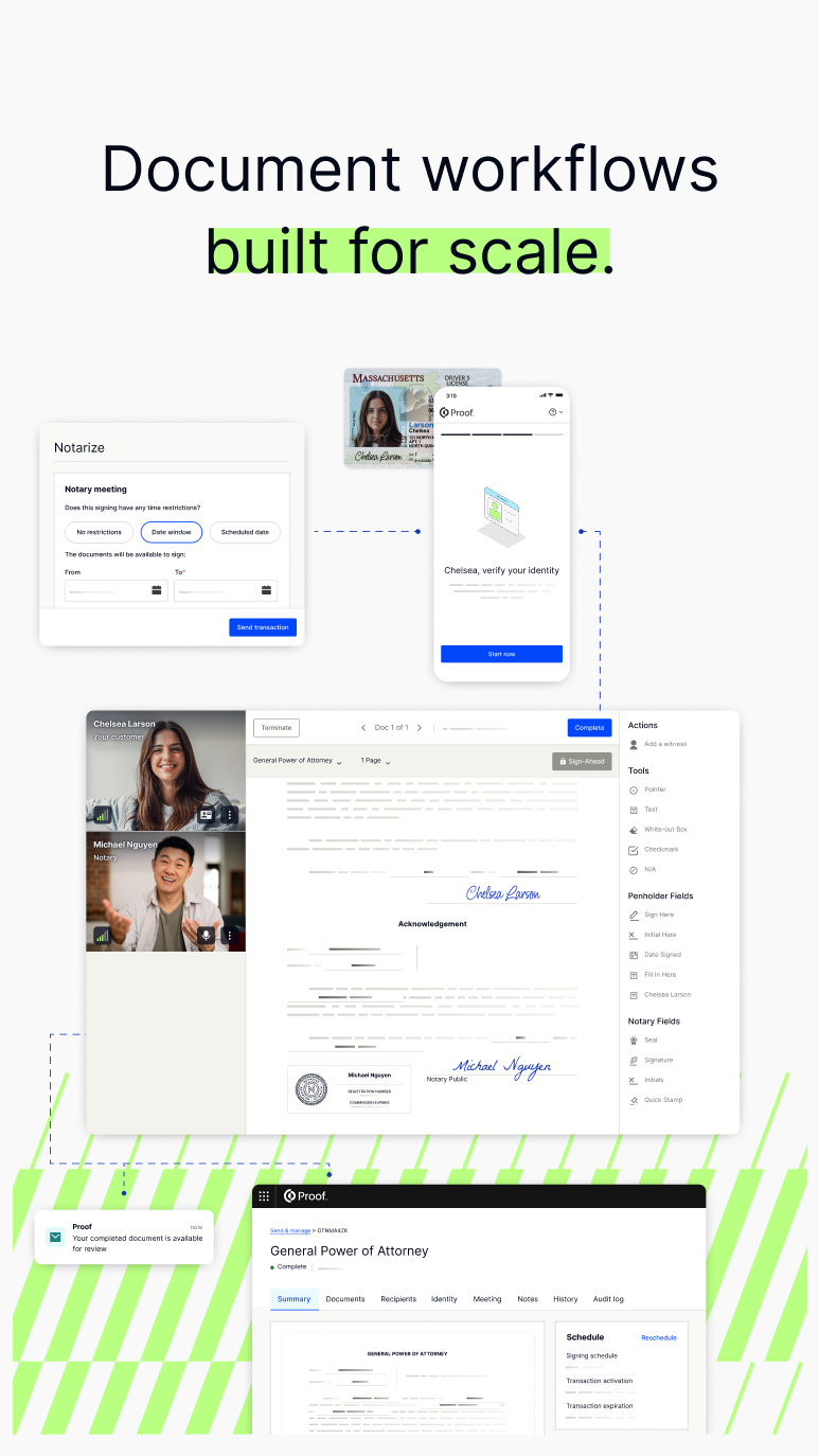 Proof.com is a digital identity and e-signature platform that enables businesses to securely verify identities and execute legally binding documents online. Trusted by enterprises across real estate, legal, and financial services, Proof combines notarization, identity verification, and document automation into a seamless workflow, helping organizations reduce fraud, accelerate transactions, and improve compliance in a digital-first world.